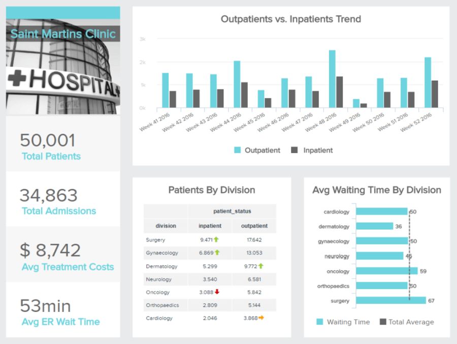 You can see here the most important metrics concerning various aspects: the number of patients that were welcomed in your facility, how long they stayed and where, how much it cost to treat them, and the average waiting time in emergency rooms. Such a holistic view helps top-management identify potential bottlenecks, spot trends and patterns over time, and in general assess the situation. This is key in order to make better-informed decisions that will improve the overall operations performance, with the goal of treating patients better and having the right staffing resources.
