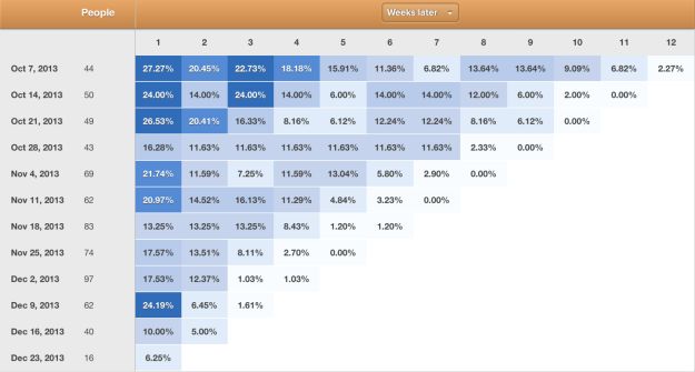 Here’s an example of a weekly cohort analysis in Mixpanel. In this chart, you can observe the engagement levels of each cohort over time as measured by week. For example, of the 44 people who joined the week of October 7th, 2013, 2.27% were still engaged (color-coded below as a sort of “heat map” with shades getting lighter) 12 weeks later: