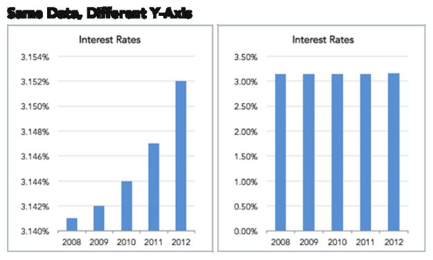 Here’s a less tongue-in-cheek example of why changing the data range in y-axis to “zoom in” on differences is misleading, as originally presented by Ravi Parikh in Gizmodo. The zero baseline below (right) shows how interest rates are not, in fact, skyrocketing (left):