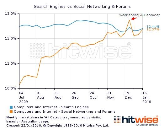 Social networking climbed fast this year, and Hitwise says it just peaked over search for a few days during the communication frenzy of Christmas. Take that, Larry and Sergey – Mark and Ev are right behind you.