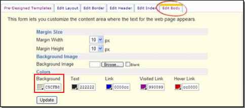 Next, I click on the 'Edit Body' tab, and locate the Background # code, which, in my case, is C5CFB8. Yours will be different for your template.