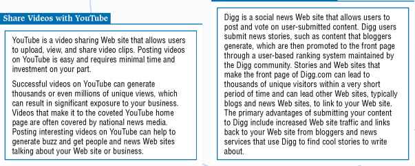 Social media optimization, or SMO, is a form of marketing that focuses on generating traffic and buzz by participation in various social media Web sites, including Facebook, Digg, and YouTube. Social networks allow you to build large lists of contacts and supporters that can help to spread the word about your business and Web site. Social news services provide a platform for others to vote on your content and share your story with others. Finally, video sharing Web sites allow you to upload, view, and share video clips with millions of potential visitors.