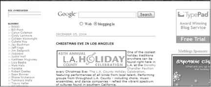 The brainchild of minor media magnets Sean Bonner and Jason DeFillippo, Blogging.la brings together the collective insights and interests of several major Los Angeles-based writers. Together, they blog for and about Los Angeles, creating community and connecting far-flung residents. There are currently 20 L.A. bloggers contributing as the mood strikes them, but usually several times a week each. During any given week, the blog contains posts about upcoming events (exhibits, parades, performances), new clubs, the weather, and — it is L.A. — traffic.