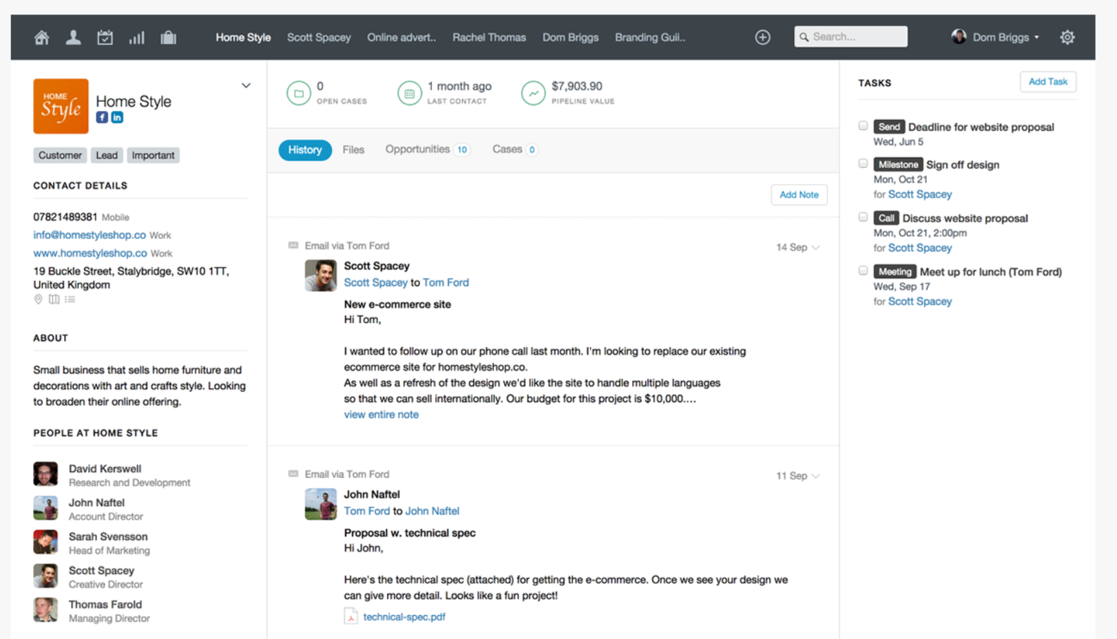 - The home icon, also known as the dashboard, takes one to a screen that gives essential details on any upcoming tasks and shows the contacts that have been recently added. One can filter the updates by the contact's name or by the items one desires to see. It is an excellent place to start one's day.