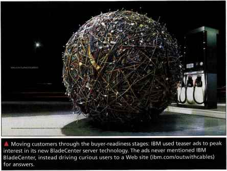 Moving customers through the buyer-readiness stages: IBM used teaser ads to peak interest in its new BladeCenter server technology. The ads never mentioned IBM BladeCenter, instead driving curious users to a Web site (¡bm.com/outwithcabies) for answers.