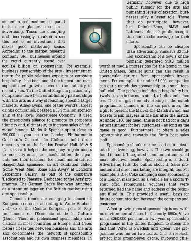 Sources; Louella Miles, 'Get fit iced', Marketing Business (March 1992), pp. 30-3; Terry Boeles, 'Why £9 billion is put on board the sponsorship bicycle', The European (t> 12 May 1994), p. 20.