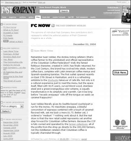 Plans for the Future: Fast Company is looking for ways to integrate FC Now content more fully into the rest of the magazine Web site, beginning by pulling FC Now posts onto topic-related pages of the magazine Web site and by automatically generating topic newsletters from blog posts. As Fast Company expands its Readers' Network — an on- and offline social network of readers — it plans to offer a blog to every member (there are currently 10,000) and then help members with related interests meet and exchange ideas.
