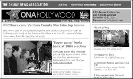 The Online News Association used Movable Type to build the Web site for its 2004 conference (shown in Figure 15-2), and it too is made up of several different blogs. Visit the site at journalists.org/2004conference, and you see that the site's polished look reads more like a news Web site than a blog. Click around, however, and you find ONA making great use of blog functionality, such as comments, to enrich the site.