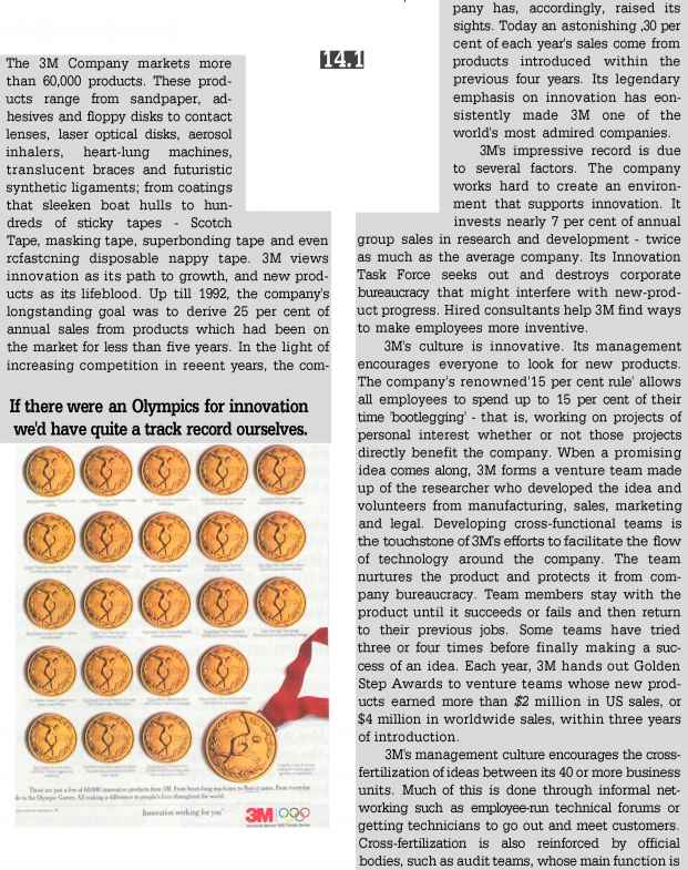 SOURCES. Martin Diokson, 'Back to the future'.Financial Times (30 May 1994), p. '3M, 60,000 and counting', The Kciinnmim (30 November 1991), pp. 86-9; Russe! Mitchell, 'Master ill' innovation: ho\v 3M keeps its neiv products coming', Knsmess Week (10 April 19S9|, pp. 58-64; Joyce Anne Oliver, '3M vet enjoys taking risks, knocking clown barriers'. Marketing News (15 April 1991), p. 13; Kevin Kelly, '3M running scared? Forget about it', Business Week (16 September 1991), pp. 59-62.