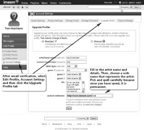 To create an artist account, first you must register to create an account by clicking on the "Create Your Account" button next to the "Log In" button. Account registration requires your name, e-mail address, a password, and date of birth. To upgrade your profile to an artist's profile, you must check your e-mail for the verification code. When that e-mail arrives, click on the link provided to verify the code, or if that doesn't work, copy the code and log on to www.imeem. com/v.aspx. Once registered, you can begin to develop the artist's profile via the "account settings" feature. One of the tabs reads "upgrade profile," and this is where you have the opportunity to upgrade the account to musician status.