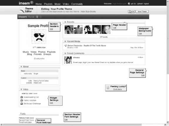 With imeem, you have the opportunity to develop the artist's profile, including photos, font styles, theme, and layout. All aspects of the page can be edited or adjusted, including the page header, section headers, wallpaper background, and general page settings.