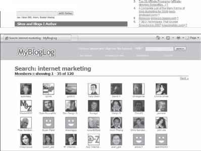 The results include MyBlogLog members interested in Internet marketing and a list of blogs related to Internet marketing.