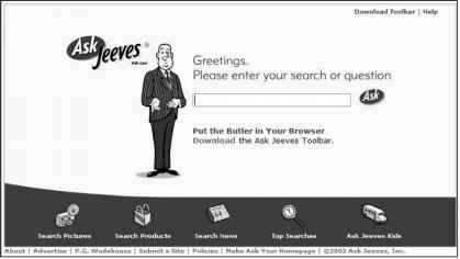 The Ask Jeeves home page (www.ask.com ) is as simple in its appearance as the home page of Google and AllTheWeb. As you can see in Figure 8-1, the page offers up a big search box (prefaced by a very polite message from Jeeves, the butler Greetings. Please enter your search or question. Enter your query into the search box, click the Ask button, and Ask Jeeves will deliver the expected page of search results. Figure 8-1 Ask Jeeves your question, and get a page of search results.