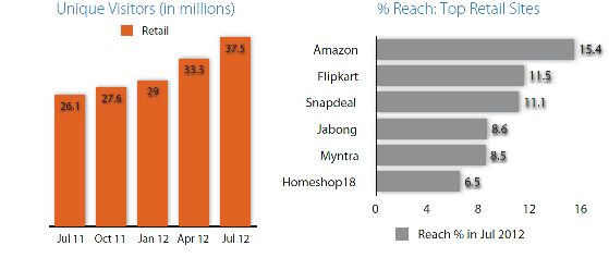 Amazon and Flipkart are the most visited sites accounting 15.4% and 11.5% of visitors respectively. Flipkart leads the way among the online retailers in India with 7.4 million unique visitors a month, growing at 431% annually. Snapdeal has been close second with 6.9 million uniques. Jabong and Myntra have been competing closely in the lifestyle category with over 5.3 million unique visitors each. HomeShop18 has over 4 million unique visitors a month.