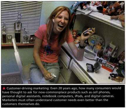 Customer-driving marketing: Even 20 years ago, how many consumers would have thought to ask for now-commonplace products such as cell phones, personal digital assistants, notebook computers, ¡Pods, and digital cameras. Marketers must often understand customer needs even better than the customers themselves do.