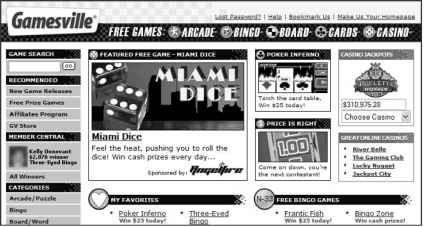 ♦ Gamesville: Gamesville (www.gamesville.com) is one of the Web's largest sites for interactive entertainment. Members can play both single-player and multi-player games, and compete in massive real-time gaming events. (See Secret #119 to learn more.)