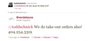 Don’t give me any crap about not having time. It is simply a matter of having someone at the restaurant, monitoring their Twitter page on a smart phone clipped to their waist.