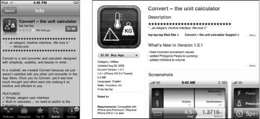 Figure 9-2. Displayed in the iPhone's App Store (lelt), Tap Tap Tap's Convert description is brief and to the point with an eye-catching testimonial, an app summary, and a bullet list of features. With the new iTunes 9 page layout (right), make sure your app summary is in the first two to three lines of your description text to remain visible.