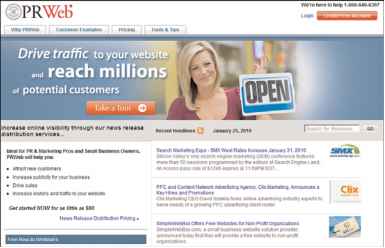 PRWeb has the potential to reach millions of readers and tens of thousands of news sites and bloggers. It is an excellent service with great coverage and depth. An example of the PRWeb home page is shown in Figure 9.7.