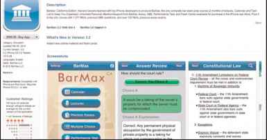 difference, of course, is that you don't get a live instructor on the iPhone/iPad. The app includes thousands of pages of prep materials and hours of audio lectures. The course takes about two months and consists of multiple choices, essays, and performance exams. And this can all be done from your iPhone/iPad. An example of this application is shown in Figure 12.6. If your app sells for more than $10, you can look for ways to communicate to your buyer that your app can save them money. One way to do this is through a case study on your product website or App Store verbiage where you explain an actual use case for your app, particularly how someone saved money by using your app. Through a case study, you should be able to demonstrate to your reader how your app saved people money and how long it took them to save X dollars. When reading such an illustration, your buyers will take comfort in knowing that they will make up their investment in your app with just a few uses. This approach to selling takes away the risk for the buyer to some degree. BarMai CA BarMai CA