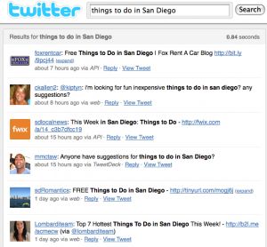 directed to you, about you and about your competitors. We have various team members set up searches for terms (everything from our client’s name to broader searches like “things to do in San Diego”) and these people are tasked with assessing the needed level of engagement with what they find. Having a tool that I have to log in, and then sort through tons of spam isn’t efficient. Furthermore, when I run these searches directly in Facebook or on Twitter or in Google blog search, I don’t need to switch screens to respond.