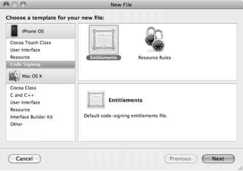 Before you can compile your application for ad hoc distribution, you need to add a special code-signing Entitlements file to your project. From Xcode's File Menu, choose New File, and then select Entitlements from the iPhone OS > Code Signing category in the window that appears (see Figure 7-37).