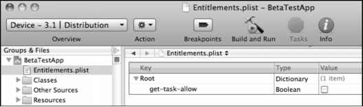 - Figure 7-38. The get-task-allow property must be unchecked in your Entitlements.plist file.