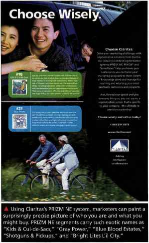 Using Claritas's PRIZM NE system, marketers can paint a surprisingly precise picture of who you are and what you might buy. PRIZM NE segments carry such exotic names as "Kids & Cul-de-Sacs," "Gray Power," "Blue Blood Estates," "Shotguns & Pickups," and "Bright Lites L'il City."