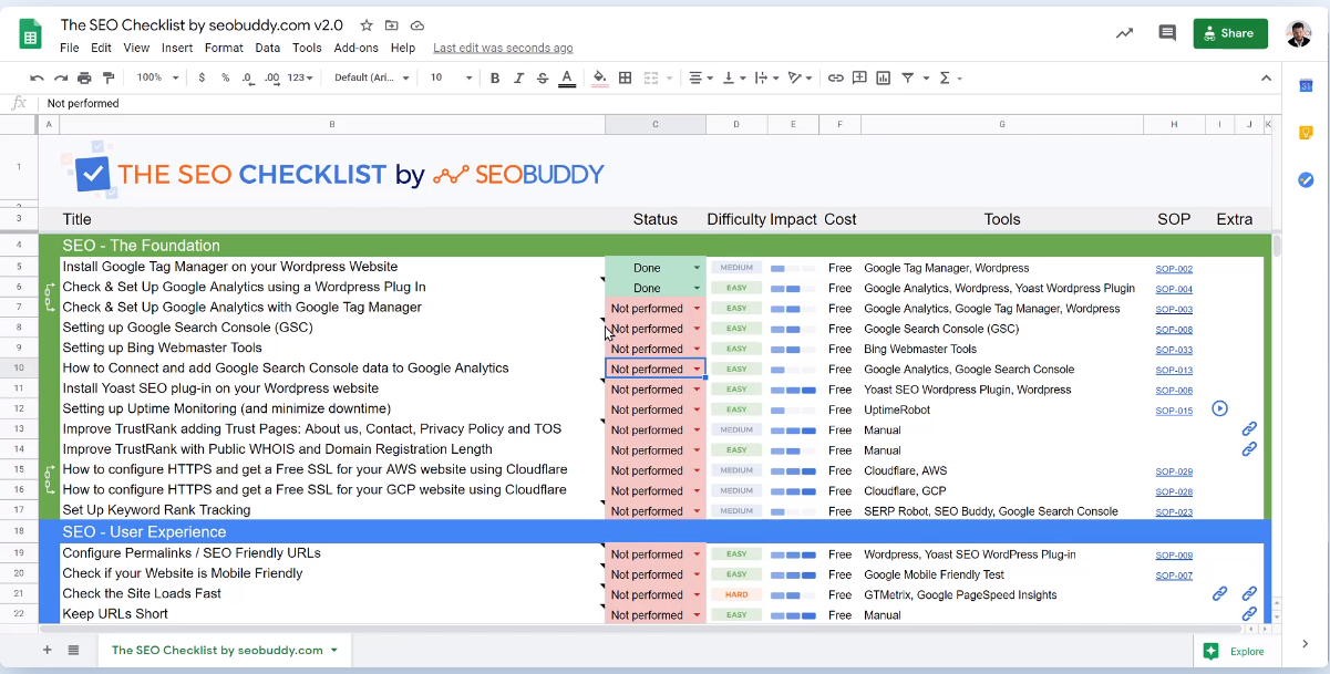 Have you ever wondered how you can attract more traffic to your website and optimize the sales of your services? The SEO Checklist is a tool designed to guide you on how you can optimize your website. It is a step-by-step guide to every important SEO actions you require to take to optimize your website and get more organic traffic. The checklist itself is a value-packed spreadsheet containing all the important SEO steps and actions you need to consider. It keeps everything you need to do in one place- a master document you will keep coming back to. Within the SEO Checklist, there are the steps to take, recommendations on the tools you might need, and links to resources that will help you complete those steps. Most people tend to think that SEO is complicated and hard to do, but the truth is that SEO is actually really simple, if you know what you are doing. Imagine how streamlined it would be if SEO was as easy as following a checklist. The main aim of the SEO Checklist is to provide a step by step framework to help you take action and climb the Google rankings faster. It is a comprehensive SEO guide you will need to get your website to number 1 page of google. Essentially, SEO is all about getting your website as much traffic as you can. It is a golden opportunity to get highly targeted, high converting traffic flowing to your website. The best news is that it is not rocket science, neither does it require special skills to rank high on google. Besides, you do not need to invest years and years mastering SEO as it simply requires you to take the correct steps consistently. Similar to staying in shape, SEO is a game of small regular actions. The only sure way of outranking your competitors in Google is by doing SEO little and often.