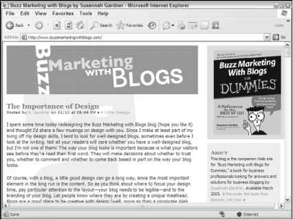 If you want to find more about how marketing and blogging can work together, a good place to start is with the blogs of marketing professionals who use blogs. The companion blog to this book, Buzz Marketing with Blogs (shown in the figure), is designed to do just that. Visit www.buzzmarketingwithblogs.com to keep abreast of blog-marketing happenings, blogging awards, opportunities, tips, and tools.