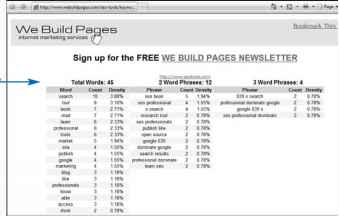 • The keyword analysis of the Web site appears. This page displays the occurrences and percentages of the page's target keywords.