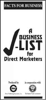 Although it cannot take the place of your attorney, the Business Checklist for Direct Marketers (see Figure 5.1) is an excellent place to begin. The brief, pamphlet-form Checklist is described as "written for mail, telephone, fax, and computer order merchandisers to give them an overview of rules or statutes that the Federal Trade Commission enforces." Note that each of the 50 states has its own laws and rules, which this pamphlet does not cover! Produced by DMA, the Direct Marketing Association, in cooperation with the Federal Trade Commission, the pamphlet is available without charge from DMA at 1120 Avenue of the Americas, New York, NY 10036-6700, or by calling (212) 768-7277.