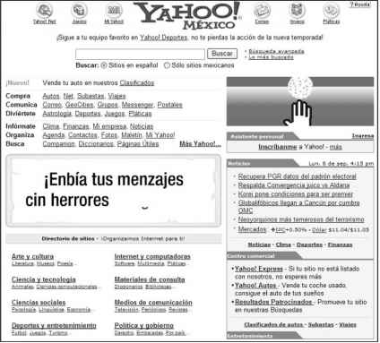For that reason, Yahoo! has been busy creating a network of World Yahoo!s, complete with country-specific site listings and pages created in the native language. Figure 1-12 shows one of these sites, Yahoo! Mexico.