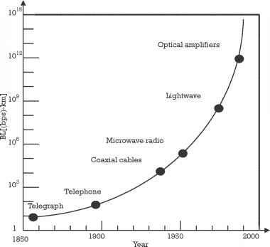 - Figure 1.5 Increase in bit rate-distance product during the 1850-2000. The emergence of a new technology is marked by a filled circle. (After: [21].)