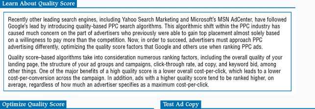 One of the most important things to do when optimizing an online marketing campaign is to test and retest all your quality score optimization strategies. There are limitless tests you can perform on your ad copy, and you can monitor the results using various free tools that Google provides. See Chapter 11 for more information on writing effective ad copy.