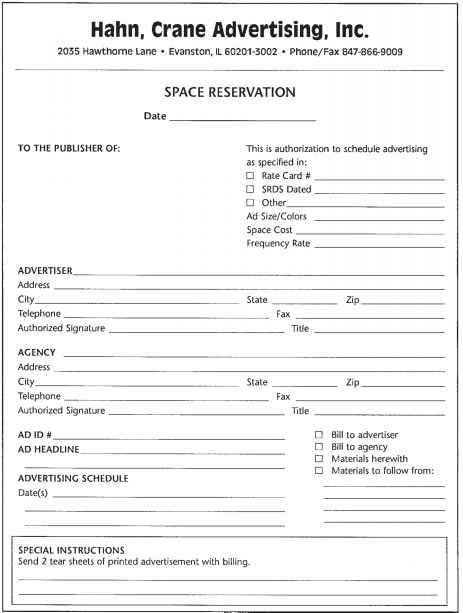 22. Notification. Notify or confirm orders, including telephone orders, to each medium by fax or mail. Use a reservation form similar to the one shown in Figure 2.8. Although reservation on a purchase order or letterhead is accepted by practically everyone, the use of a media form gives a better assurance that all pertinent instructions will be covered.
