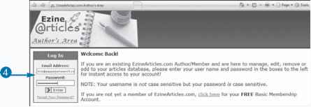4 Once you have completed the registration form and verified your e-mail address, return to Ezinearticles.com and enter a login name and password.
