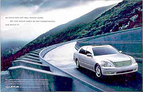 "We could have left well encutjh alcne. But ite! mould nardi/ is very characteristic. .-.■nn d it? "LexuS ads, and ¡13 campaign sio^sn, HTiie Passmafe Pursuit of Perfection,' express liifi ocrnpjny's marketing ph-asoptiy. only me best is good ertough tor ¡Is customers