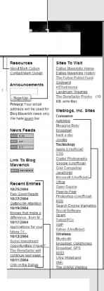 I A collection of related info: On the right- or left-hand side of the browser window, this info may consist of e-mail subscription opportunities, explanatory or biographical information, archived entries, and links to other blogs that the blogger reads regularly and recommends.