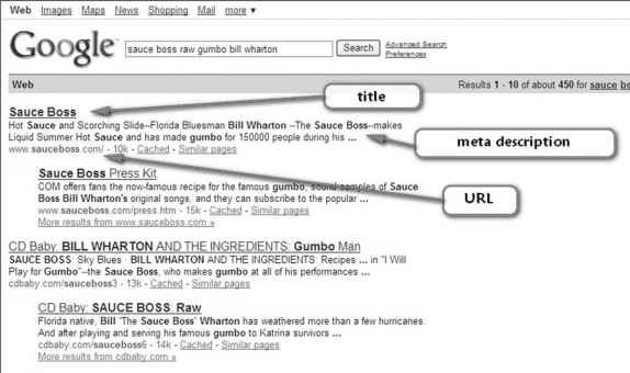 page and specify which search terms should be used to list the site on search engines. Popular meta tags can affect search engine rankings and are generally listed in the sections "Meta Keywords" and "Meta Description." Search engines often use the description meta tag and display it in the results. A meta tag can be generated automatically by the site www.submitcorner.com. The example tag shown here will let a search engine know to categorize the above web site under blues music, slide guitar, and by the artist's other endeavor, Louisianastyle cooking.