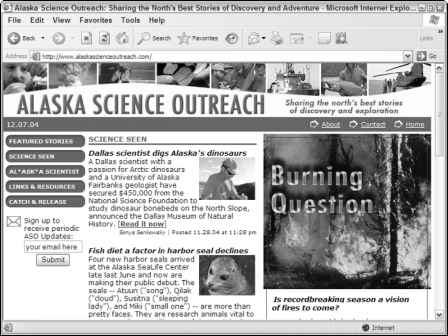 Many of the Web sites built with blog software actually combine multiple blogs in the same page. For an example, take a look at Alaska Science Outreach (www.alaskascienceoutreach.com), a science information clearinghouse site run by freelance writer Sonya Senkowsky. Alaska Science Outreach, shown in Figure 15-1, runs on pMachine's ExpressionEngine, but very little of it looks or acts like a blog. Each section of the site is actually a separate blog.