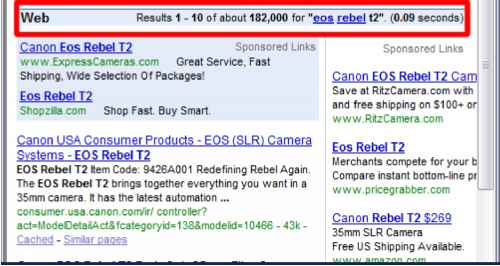This example shows only 182,000 results. That's only 9% of the results that were displayed for the more generic keyword "slr camera". Just as I had pointed out earlier in the paid search example, there is less competition for more specific keywords.