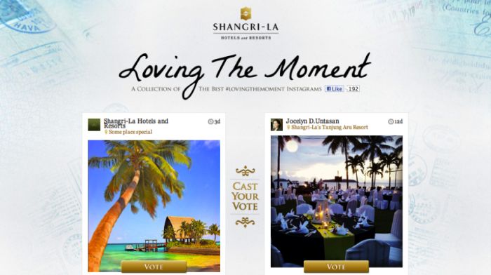 Shangri-La Hotels and Resorts introduced a microsite with Instagram as the centerpiece of engagement. Users are encouraged to tag their Instagram shots taken at Shangri-La properties with the hashtag #lovingthemoment. The campaign feeds into the microsite where users can vote for their favorite Shangri-La instagrams. Both guests and staff members are encouraged to take pictures and share them to tell a story about cities they’re in.