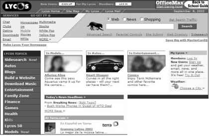 The Lycos home page (www.lycos.com), shown in Figure 5-1, contains a variety of links to different content and services. There are links to major services (including My Lycos and Lycos Mail) at the very top of the page, with a search box just below that. The left side of the page contains links to Lycos topics with news and other highlights featured in the center of the page.