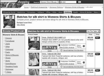 The first page of results you see after you conduct a shopping search lists those shopping categories where the item you searched for can be found. For example, if you search for "silk shirt," you'll see that merchandise is listed in five different categories: Mens Shirts, Womens Shirts & Blouses, Other Womens Clothing, Other Junior & Teens Apparel, and Other Mens Clothing. Click a category and you see the catalog-type page shown in Figure 5-4. This is different from a plain text listing in that each listing includes a picture of the merchandise, a brief description, current price, and a link to the store where the merchandise is sold. All you have to do is click through to place your order.