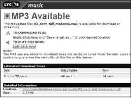 It's important to note that the results of a Lycos MP3 search link to files on sites all across the Web. Lycos is not part of a file-swapping network, and does not store any of these MP3 files on its own site. Lycos does, however, offer a separate subscription music service, called Rhapsody. Go to music.lycos.com/rhapsody/ to learn more.