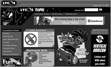 ♦ Lycos Zone: Lycos Zone (www.lycoszone.com) is a site just for kids, including educational content and entertainment. (See Secret #120 to learn more.)