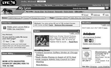 Like most other portals, Lycos offers a way to customize its content to create your own personal start page. This service, called My Lycos, is accessed by clicking the My Lycos link on the Lycos home page or by going directly to my.lycos.com.