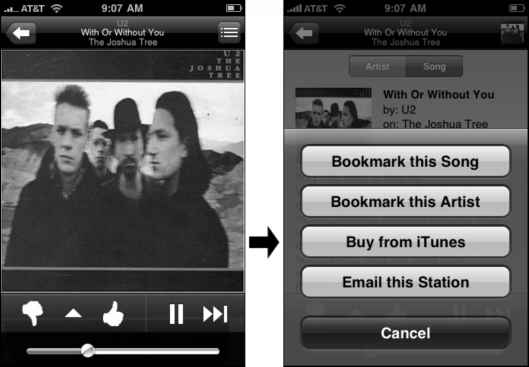 - Figure 6-16. The Pandora Internet radio app includes affiliate links to the iPhone's embedded iTunes Store, enabling listeners to easily buy the currently playing song.