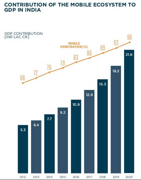 Currently the mobile economy in India is worth USD 130 Mn (INR 1.27L), this means that by 2020 it is going to take a leap of 408%. The figure below shows the rise of the contribution of mobile economy in India to the country’s GDP.